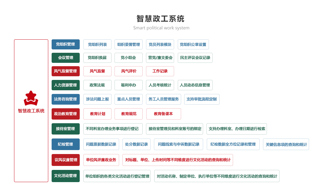 包含控制臺、組織架構(gòu)、黨建動態(tài)、黨員學(xué)習(xí)、組織活動、志愿服務(wù)、黨費(fèi)管理、監(jiān)督執(zhí)紀(jì)功能模塊。通過黨建在線學(xué)習(xí)教育,解決黨建學(xué)習(xí)難問題,實(shí)現(xiàn)便捷化管理;黨務(wù)工作流程及黨建資訊全掌握、黨建工作全方位可視,統(tǒng)一數(shù)據(jù)標(biāo)準(zhǔn),智能分析績效考評,成績一目了然,做到數(shù)據(jù)指標(biāo)化;積極推進(jìn)黨建工作高效完成,信息高效處理。