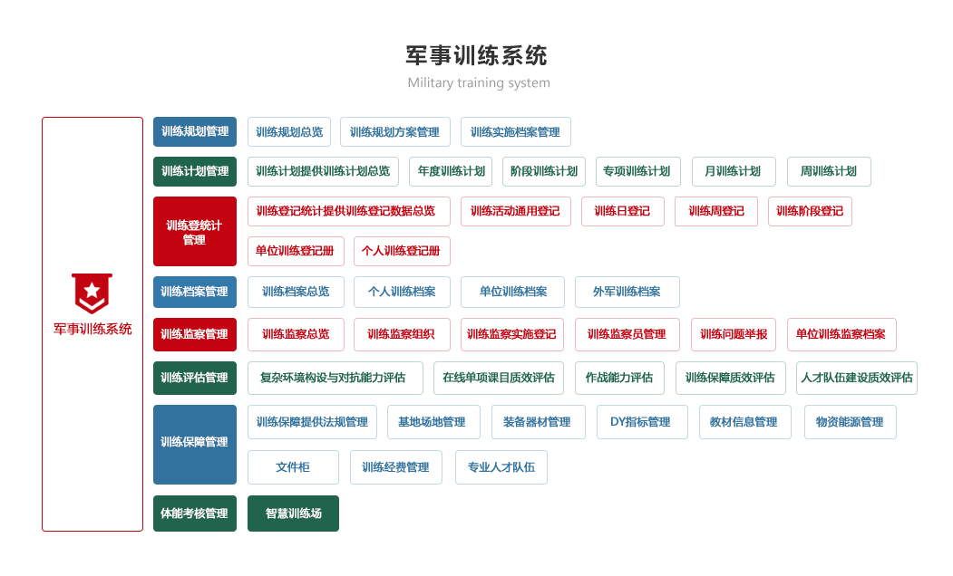 包括訓(xùn)練計劃、訓(xùn)練檢查、訓(xùn)練考核、訓(xùn)練檔案、訓(xùn)練資源模塊,實(shí)現(xiàn)對訓(xùn)練計劃制定情況自動統(tǒng)計和智能分析、逐步解決訓(xùn)練時間、訓(xùn)練人員落實(shí)情況、實(shí)現(xiàn)智能報靶和體能訓(xùn)練監(jiān)測、實(shí)現(xiàn)網(wǎng)上模擬訓(xùn)練與考核的智能化、自動化和便捷化,對訓(xùn)練資源科學(xué)管理,確保為軍事訓(xùn)練工作有力支撐。
