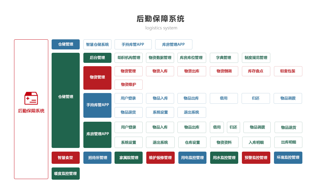 綜合保障系統(tǒng)依托物聯(lián)網(wǎng)、RFID識別和傳感技術(shù),著眼作戰(zhàn)精準(zhǔn)保障、戰(zhàn)備常態(tài)保障和官兵生活保障,對戰(zhàn)備物資、裝備器材、營房物資和被裝物資等的全生命周期的電子化管理,對官兵的健康實(shí)時監(jiān)護(hù)。包含財務(wù)管理、軍需油運(yùn)、武器裝備、衛(wèi)勤管理、營房管理模塊。確保部隊出動,車輛給養(yǎng)油料跟得上,裝備維護(hù)情況實(shí)時掌握,營房管理工作平時與戰(zhàn)備同步推進(jìn)。